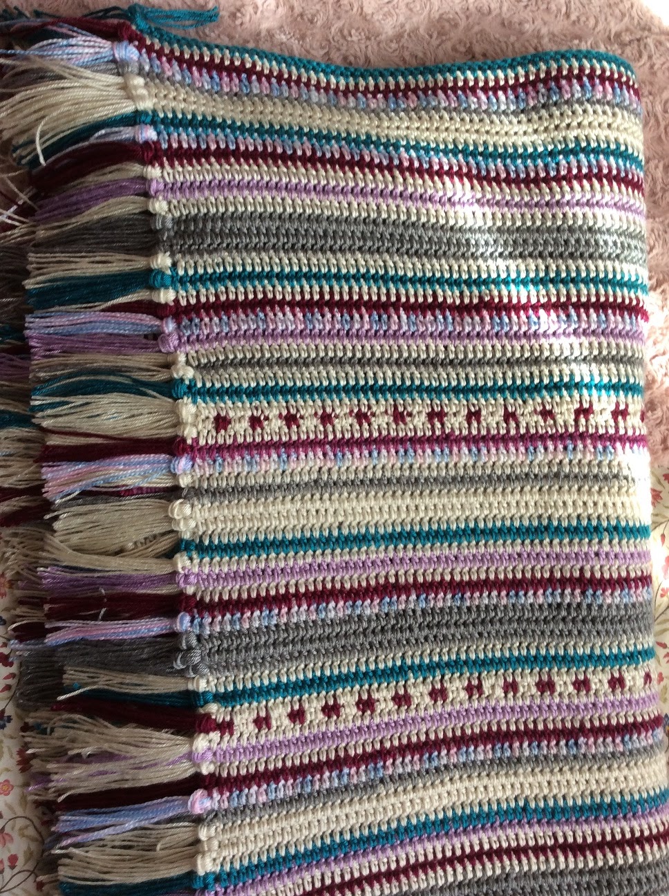 Para terminarla, pensé en ponerle algún borde bonito, pero al final le puse flecos, probé de muchos colores, pero acabé poniendolos del mismo color de cada vuelta.
